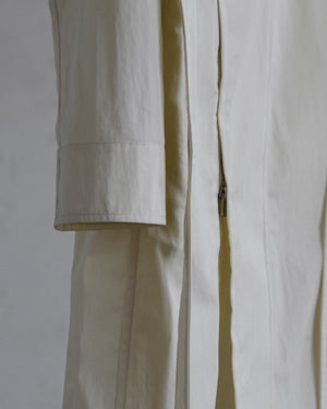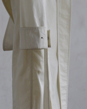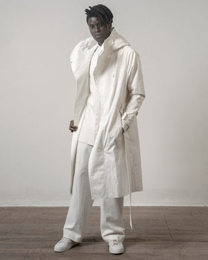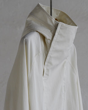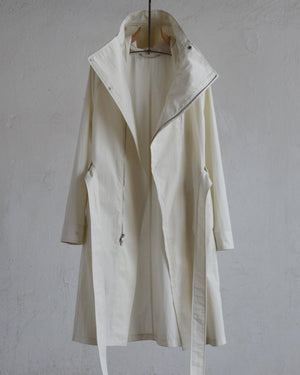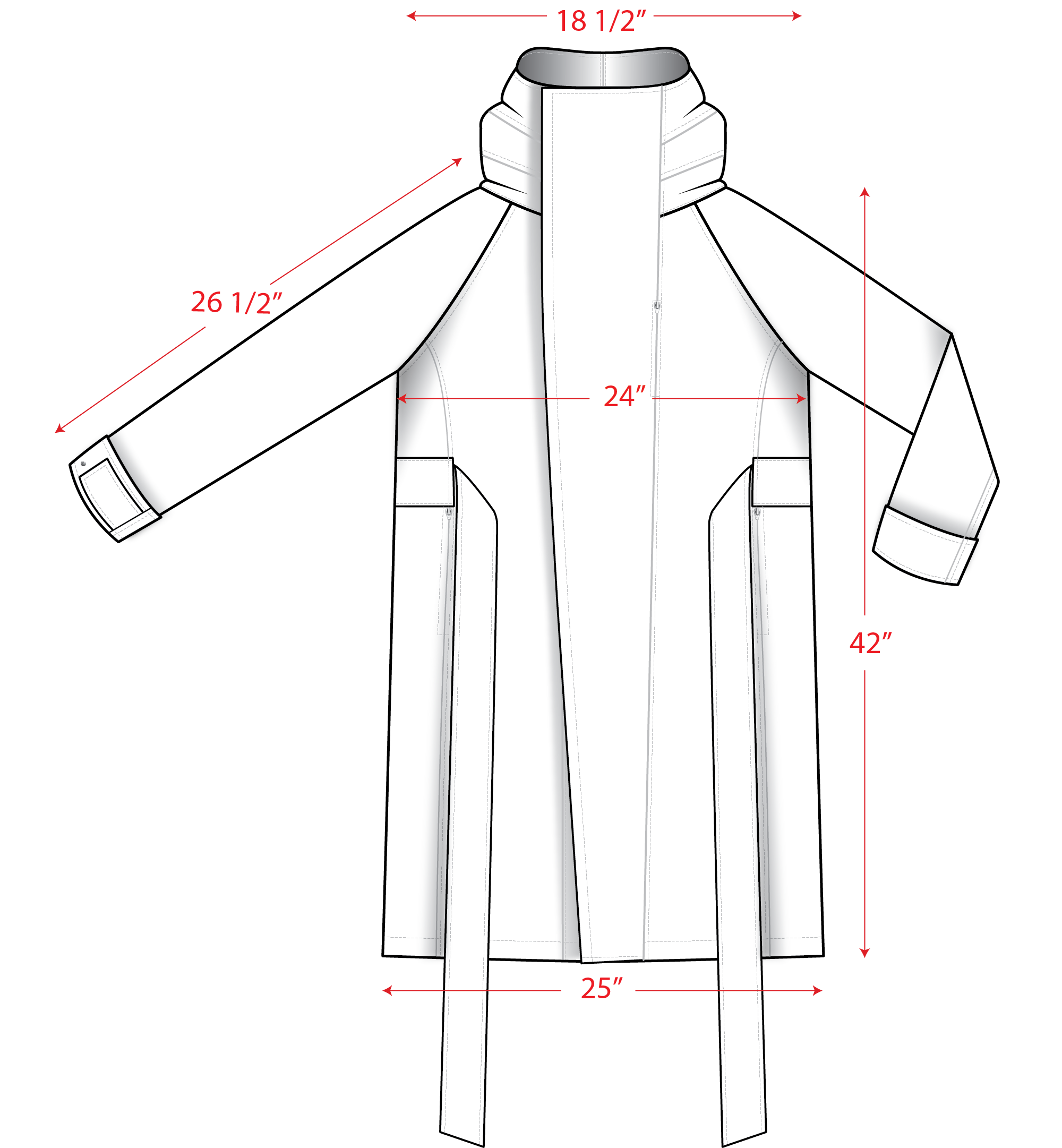 Luxuriously smooth and tough Excella zippers seal the front closure + pockets, and snaps further enclose the hood and adjust the cuffs which can be worn down for coverage or rolled back to normal length. The long belt can be be tied at the waste to keep out the wind, worn casually at the sides, removed, or utilized inside as carrying straps.