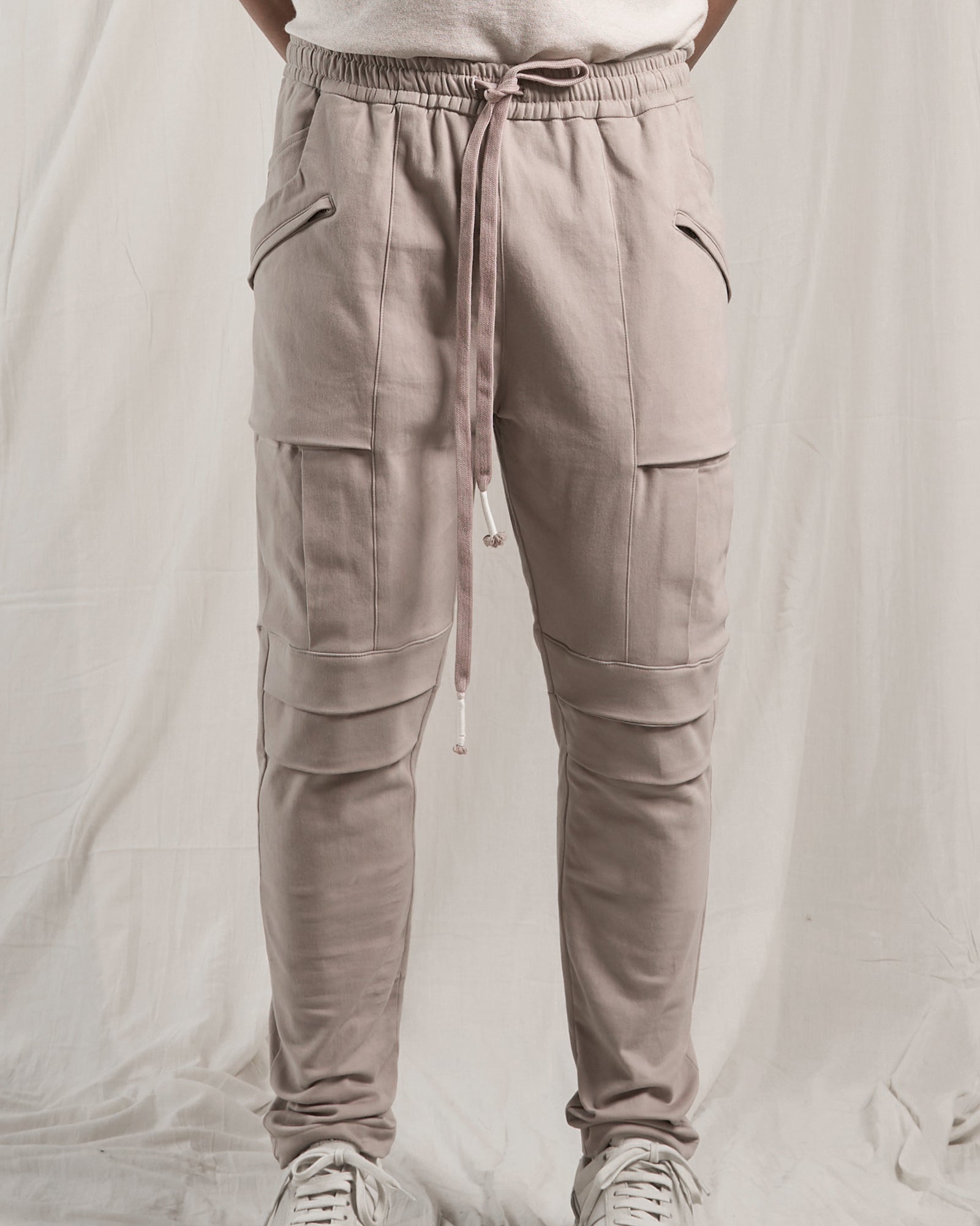 The waistband combines a secure elastic with a drawstring, offering comfort and a perfect fit without the visual distraction of topstitching or belt loops.
