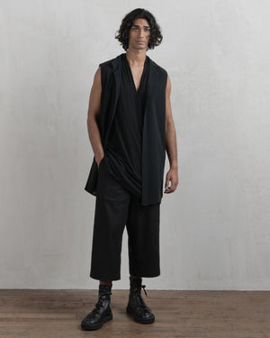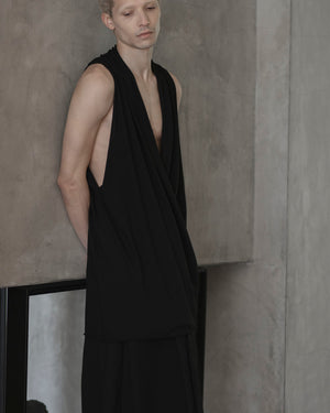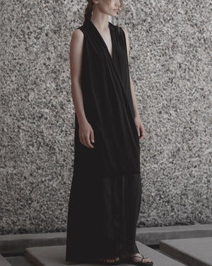 A long, sleeveless cross-over top or dress in a sublimely soft and fluid cotton/silk.