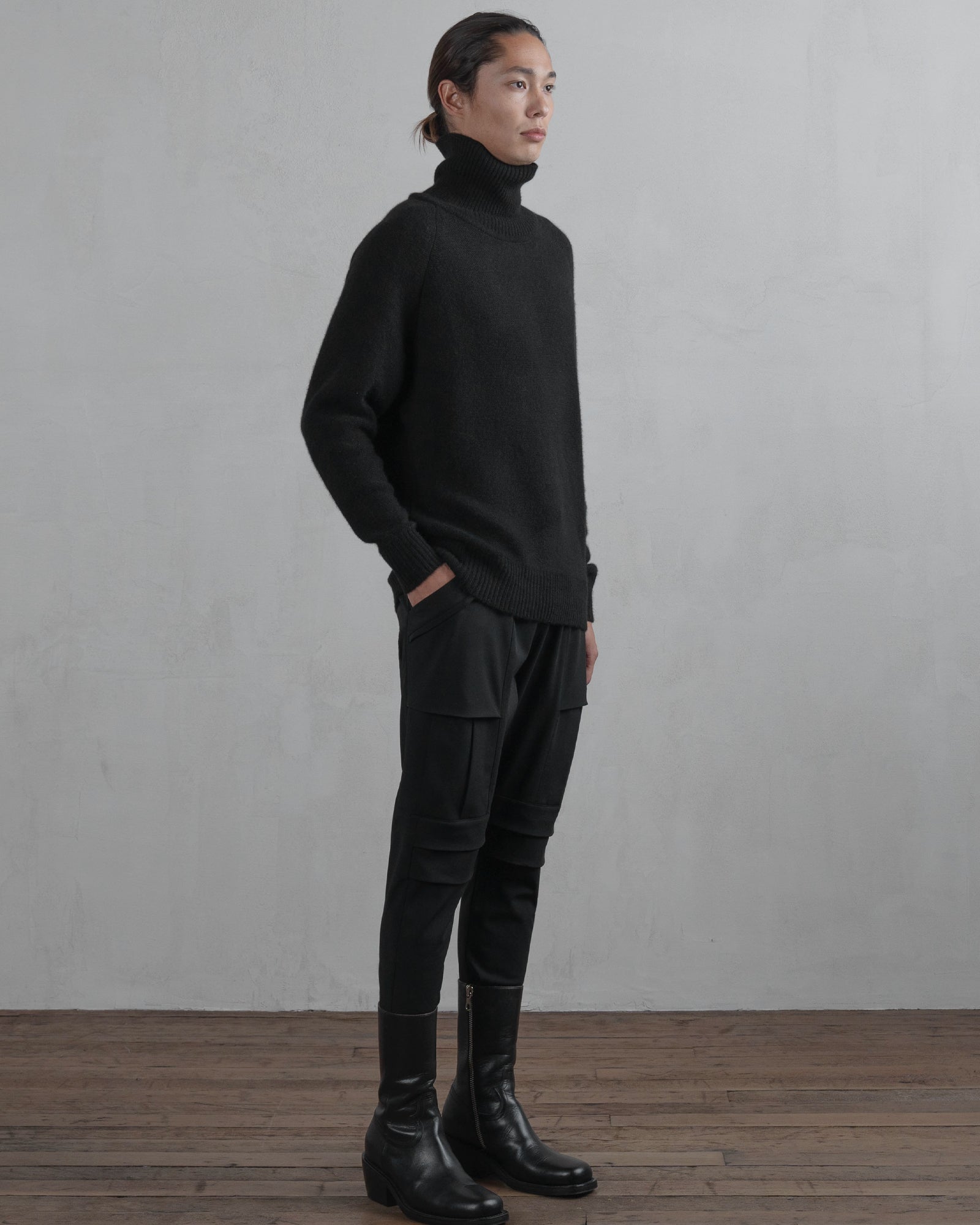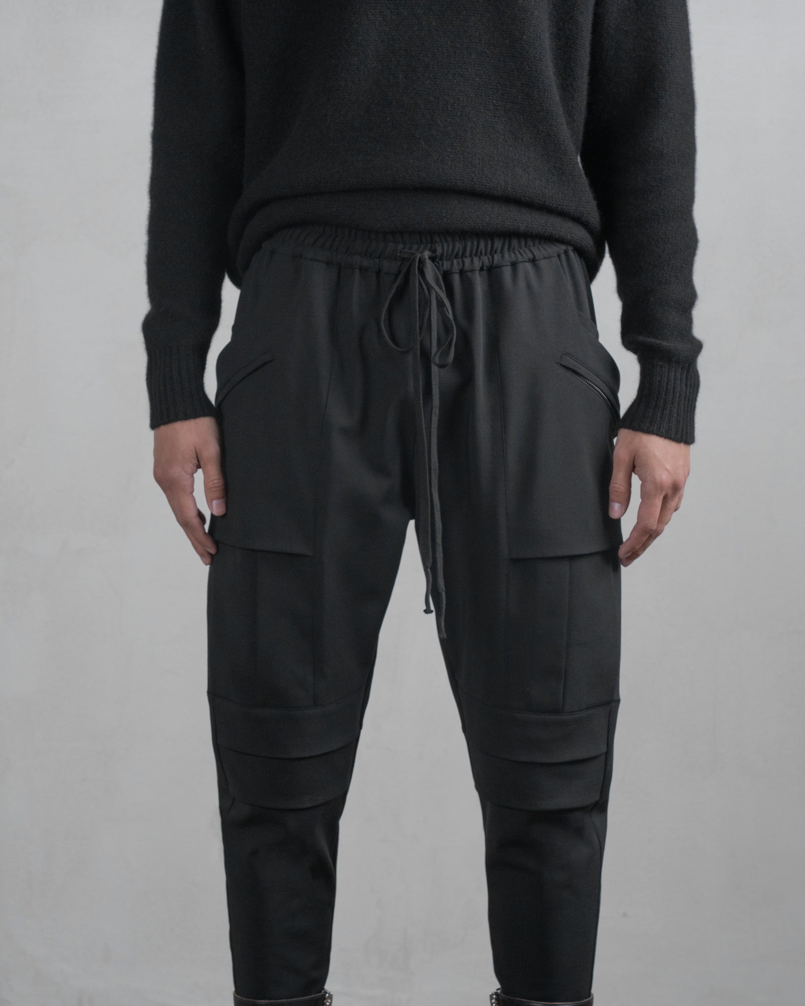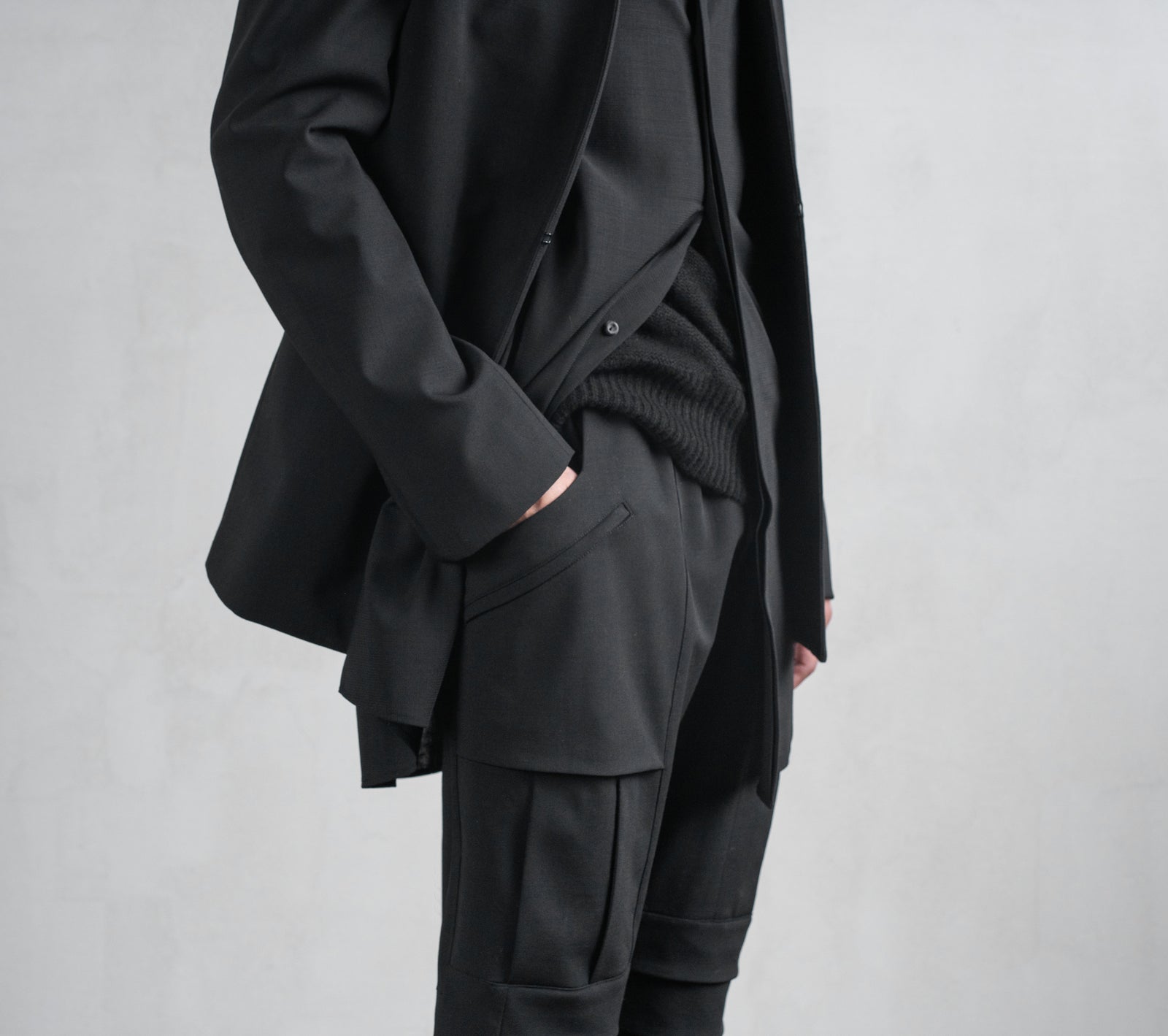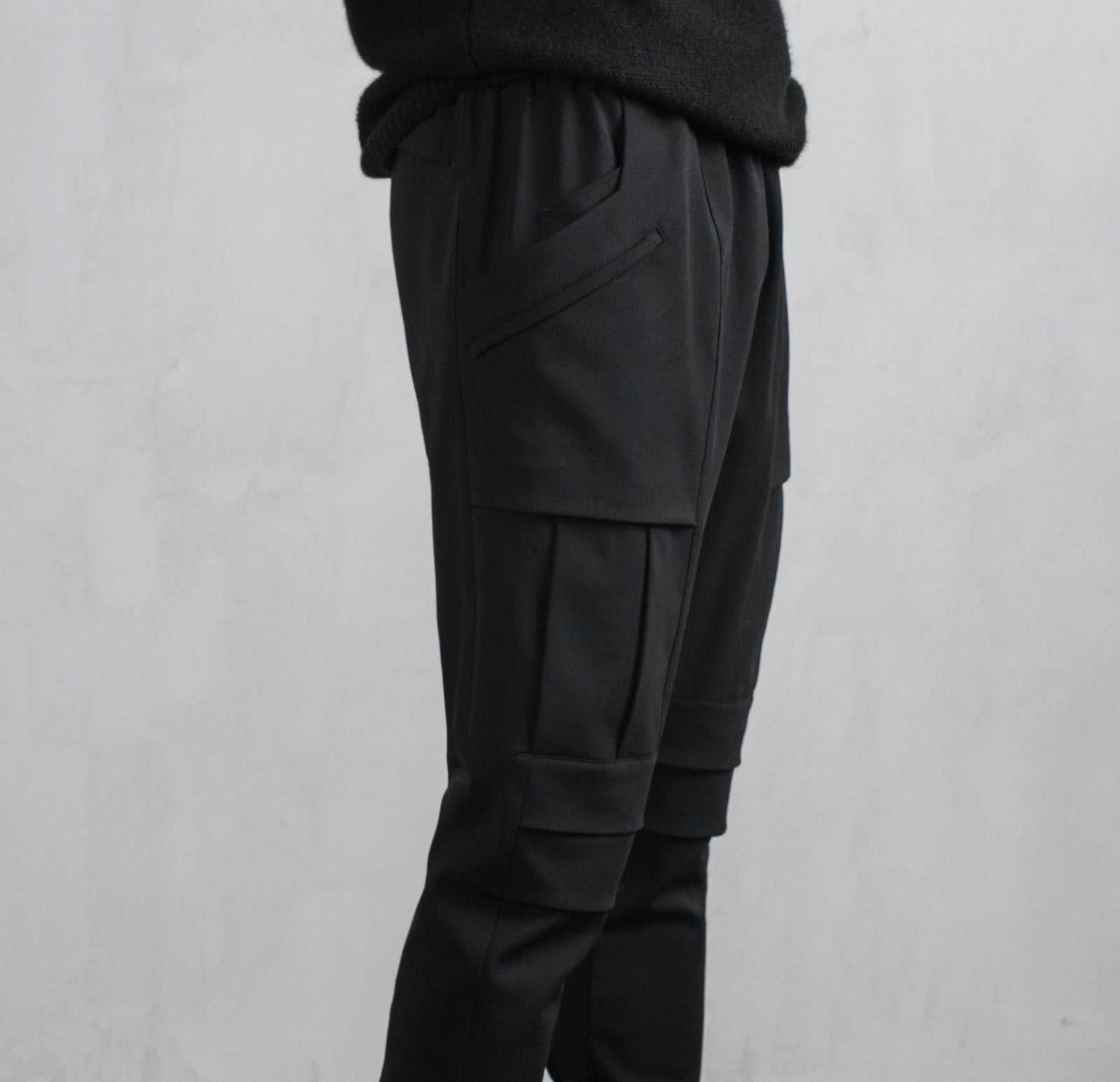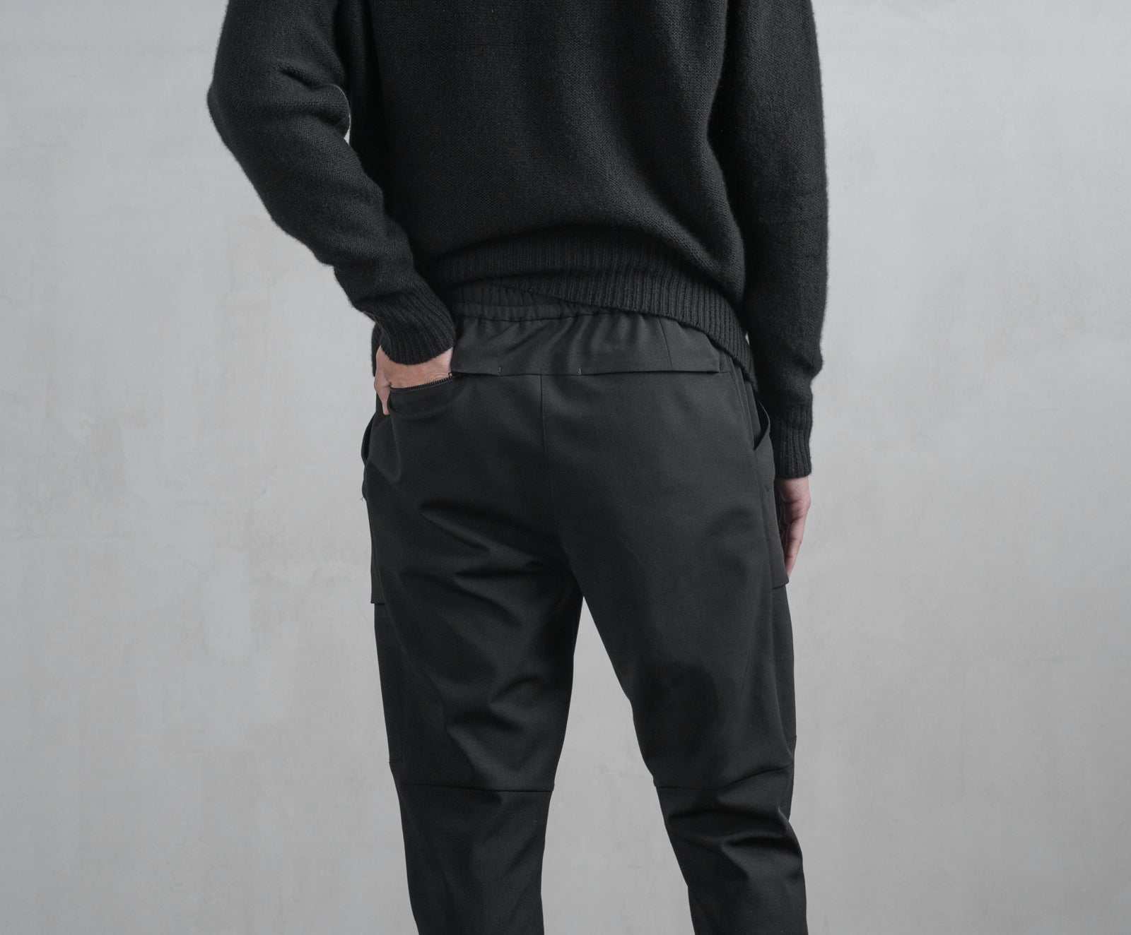 Every detail of the Escher Pant has been purposefully designed to marry form and function.  The pant achieves a clean tailored look while simultaneously delivering exceptional utility, with a total of 10 pockets:  Primary side pockets with integrated key and phone compartments for effortless organization; hidden zipper pockets, subtly layered between the main pockets and pant body, with welts for a refined finish; cargo-like pockets, seamlessly integrated into the body (not merely patched on) that accordion out for volume while preserving the pant’s elegant silhouette when closed; and back zipper pockets, discreetly secured beneath an extended folded seam.