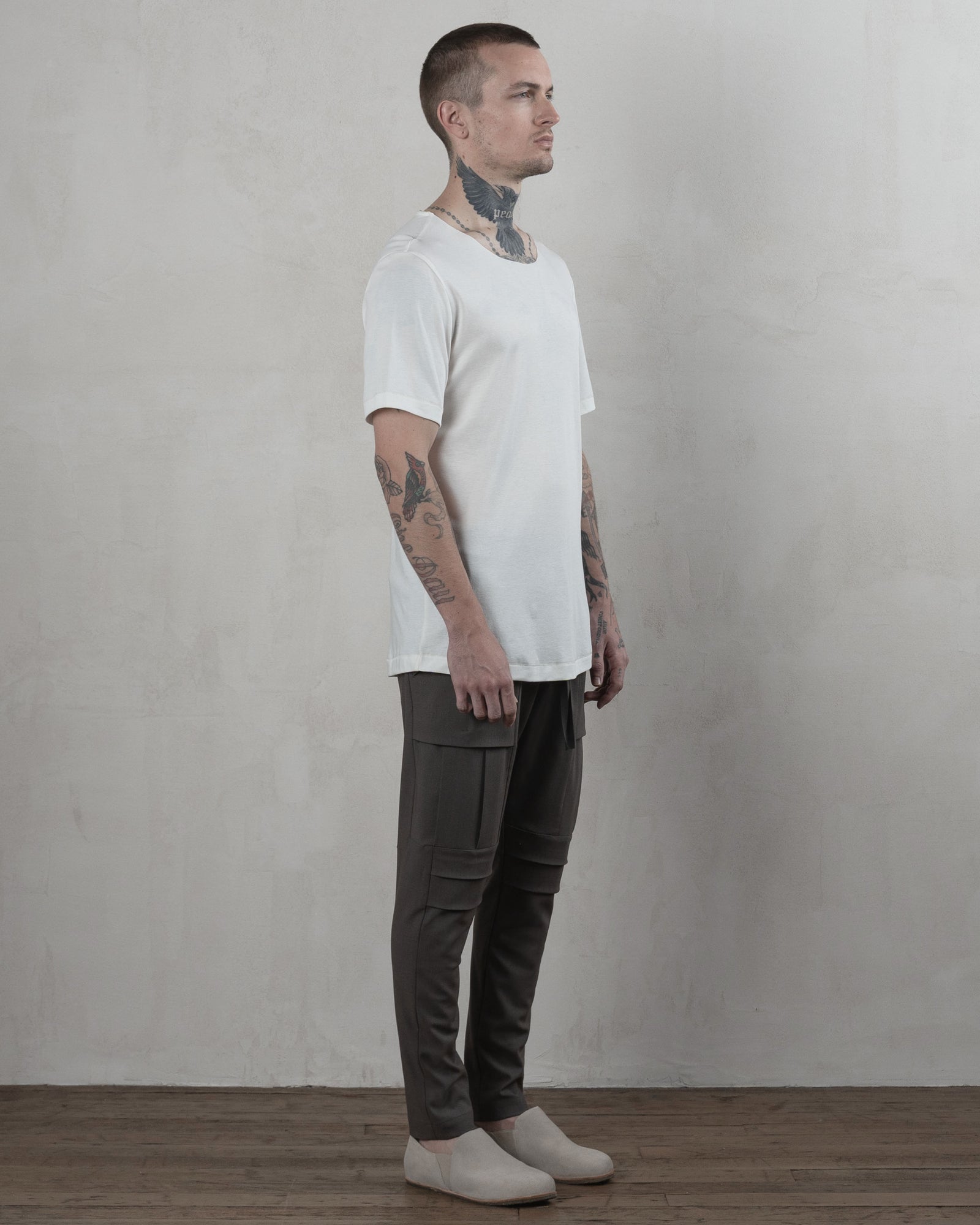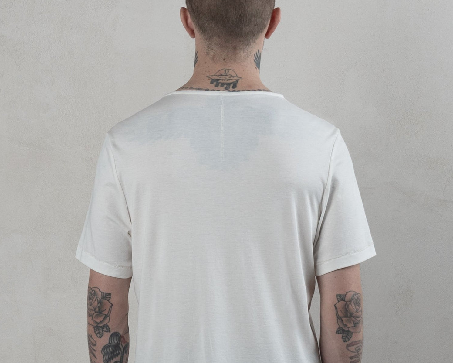Details matter: a raw-edge front neckline adds further refinement, the reinforced back neck ensures shape retention, and exposed hem and back stitching provide the perfect finishing touches.