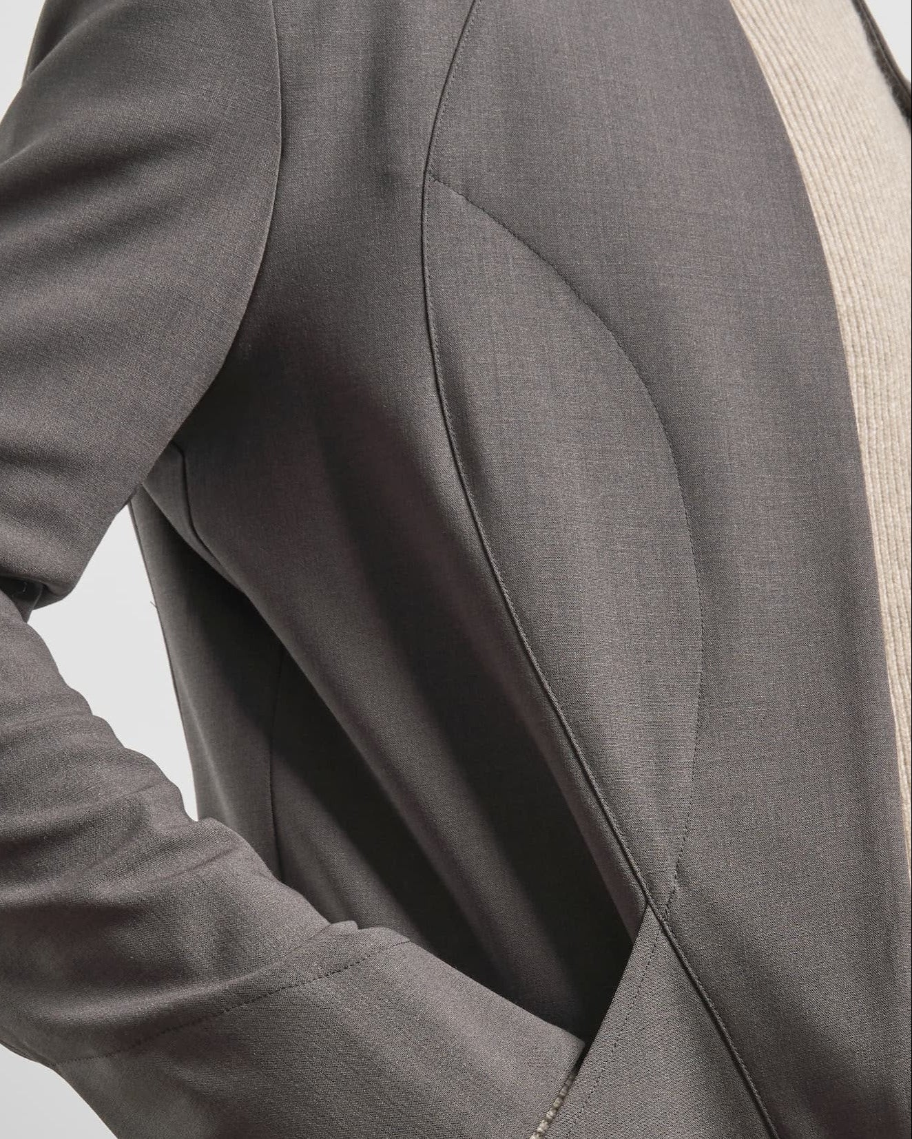 The unique construction is unlined, keeping it cool and feather-light. The extended facing doubles up the shoulder with precisely fused segments that create just the right rigidity at the shoulders, resulting in a jacket that can be packed in a bag, worn casually in the neighborhood, and dressed up for evening outings. The collar is engineered to be worn both upright or rolled back.