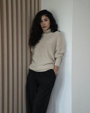A sanctuary of comfort in an exceptionally soft natural cashmere, the fluid silhouette of this turtleneck is balanced by narrowing rib-finished sleeves.